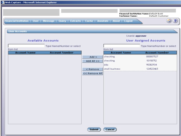 Users are associated with one or more deposit accounts in the User Accounts window. To access this window, select Users/View Users from the menubar. Select a user and click the User Accounts button.